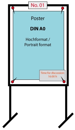 Die Postersitzungen der Fachverbände Hadronen und Kerne (HK) und der Didaktik der Physik (DD) findet im Foyer der Chemie-Hörsäle statt. Jede Posterwand hat eine Nummer, die der Nummer des Posters im wissenschaftlichen Programm entspricht. Für die Anbringung der Poster werden Posterwände (Höhe x Breite =1,5 m x 1,0 m) und entsprechendes Befestigungsmaterial zur Verfügung gestellt. Die präsentierenden Autoren werden gebeten, mindestens die Hälte der Zeit der Postersitzung für Diskussionen an ihrem Poster zur Verfügung zu stehen. Bitte markieren Sie diese Zeit auf Ihrem Poster. Bitte entfernen Sie die Poster nach der Sitzung. Die Tagungsleitung kann keine Haftung übernehmen.